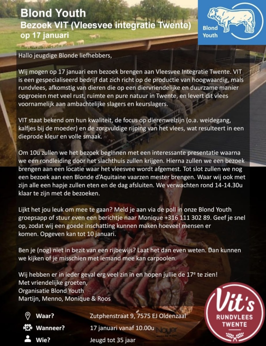 VIT ontvangt de jongeren die zijn aangesloten bij Blond Youth op hun bedrijf in Oldenzaal. Na het bezichtigen en rondleiding in het slachthuis volgen nog bezoeken aan bedrijven waar Blondes worden afgemest.