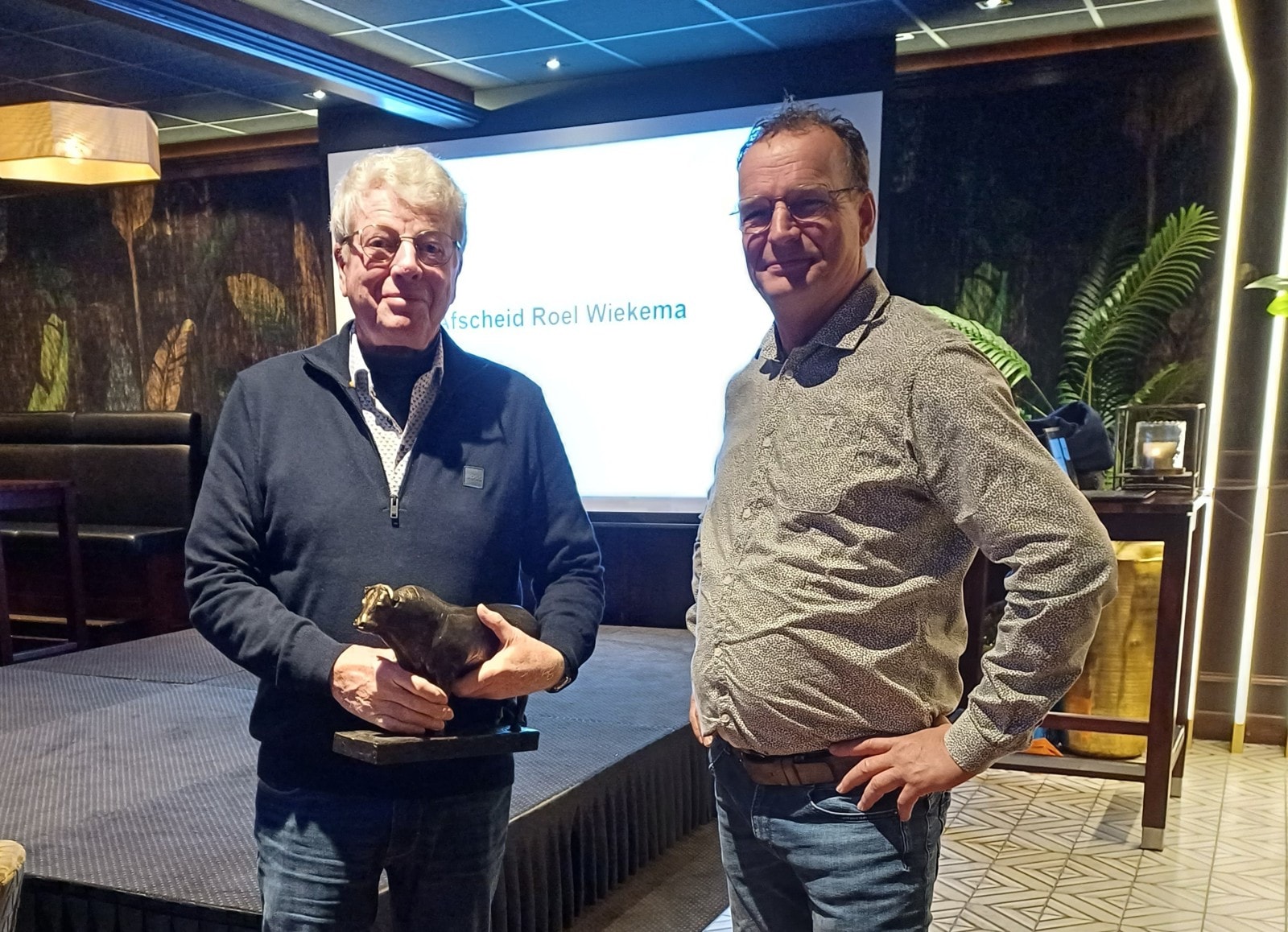 Wiekema ontving als blijk van waardering naast het erelidmaatschap ook een blijvende herinnering aan de fokadviescommissie. Dit in de vorm van een fraai ingelijste poster met veel fokproducten die getest en geveild zijn op het opfokstation en een fraai beeld van een Blonde d’Aquitaine stier.