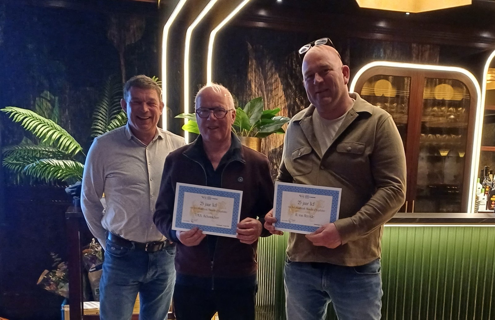 Op de Algemene Ledenvergadering zijn de jubilarissen gehuldigd die 25 jaar lid zijn van het stamboek. De aanwezige jubilarissen Henri van Heerde en Theo Schumacher ontvingen hiervoor een oorkonde van voorzitter Jan Geert Veldman.